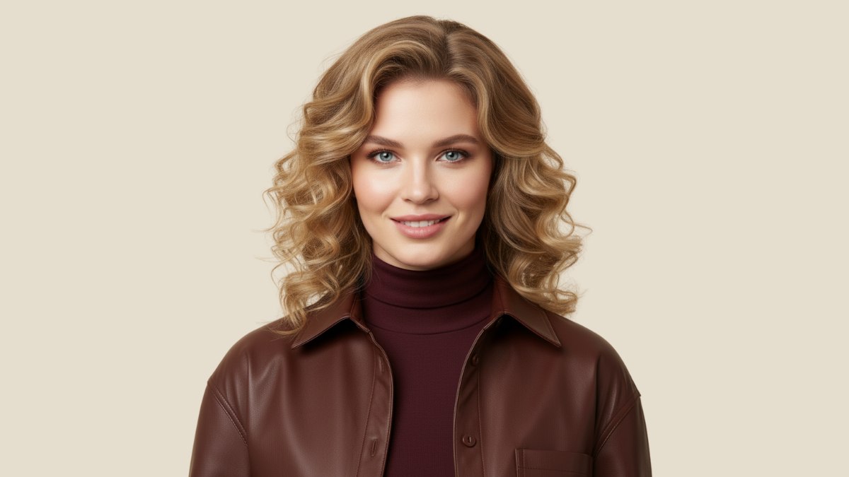 La chemise en cuir marron associée à un col roulé bordeaux coordonné transforme cette coiffure en une véritable déclaration de style. L’éclat du cuir et la profondeur du bordeaux mettent en valeur la chaleur dorée de la couleur des cheveux, créant une palette de tons automnaux élégante et cohérente.