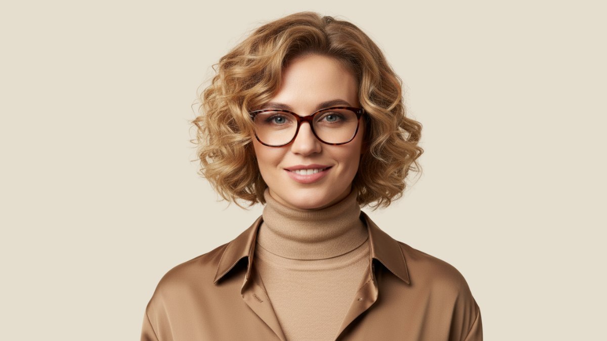 Le choix du col roulé couleur camel associé à une chemise en soie coordonnée crée un ensemble monochrome et sophistiqué, laissant la coiffure occuper le premier plan. Les tons chauds et neutres de la tenue s’harmonisent parfaitement avec les reflets dorés des cheveux, pour une esthétique cohérente et résolument luxueuse.