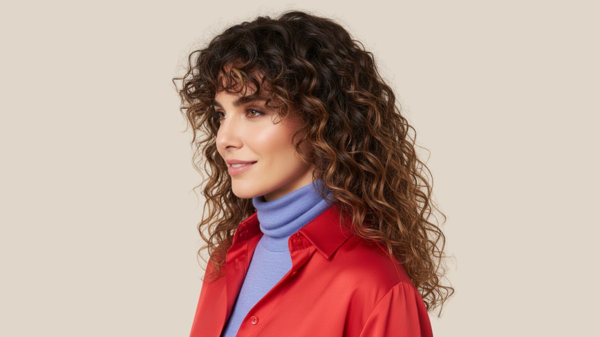 La frange est un élément phare : bouclée, texturée et tombant sur le front de manière volontairement décoiffée. Il ne s’agit pas d’une frange nette et droite, mais plutôt d’un rideau de boucles souples et irrégulières qui apporte une sensation romantique et légèrement bohème à l’ensemble du style. Les mèches encadrant le visage prolongent cette esthétique, avec des longueurs variées qui s’enroulent autour des pommettes et de la mâchoire.