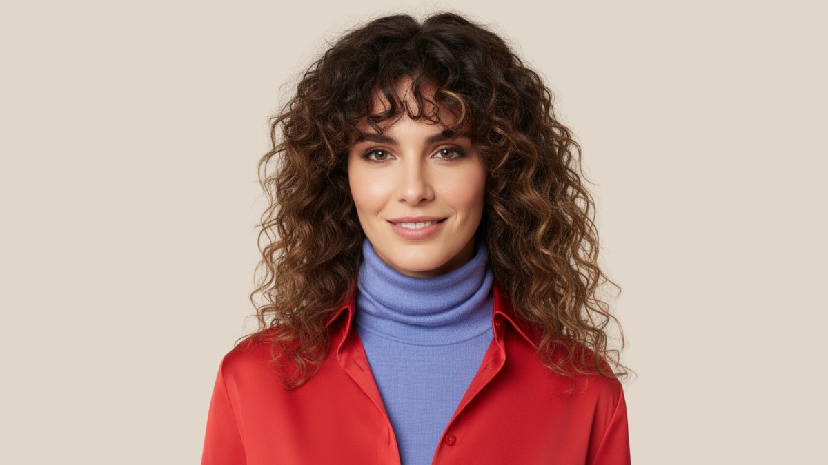 L’association entre la chemise en satin rouge vif et le col roulé bleu est tout simplement brillante. C’est audacieux, graphique et résolument moderne. Le contraste de couleurs (le rouge et le bleu étant presque opposés sur le cercle chromatique) génère une énergie qui reflète parfaitement le caractère vibrant de la chevelure. Le rouge chaud fait écho aux reflets cuivrés, tandis que le bleu apporte un contraste frais et élégant.
