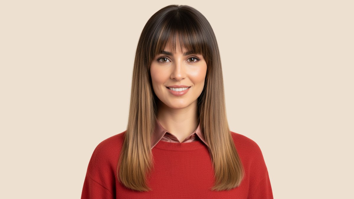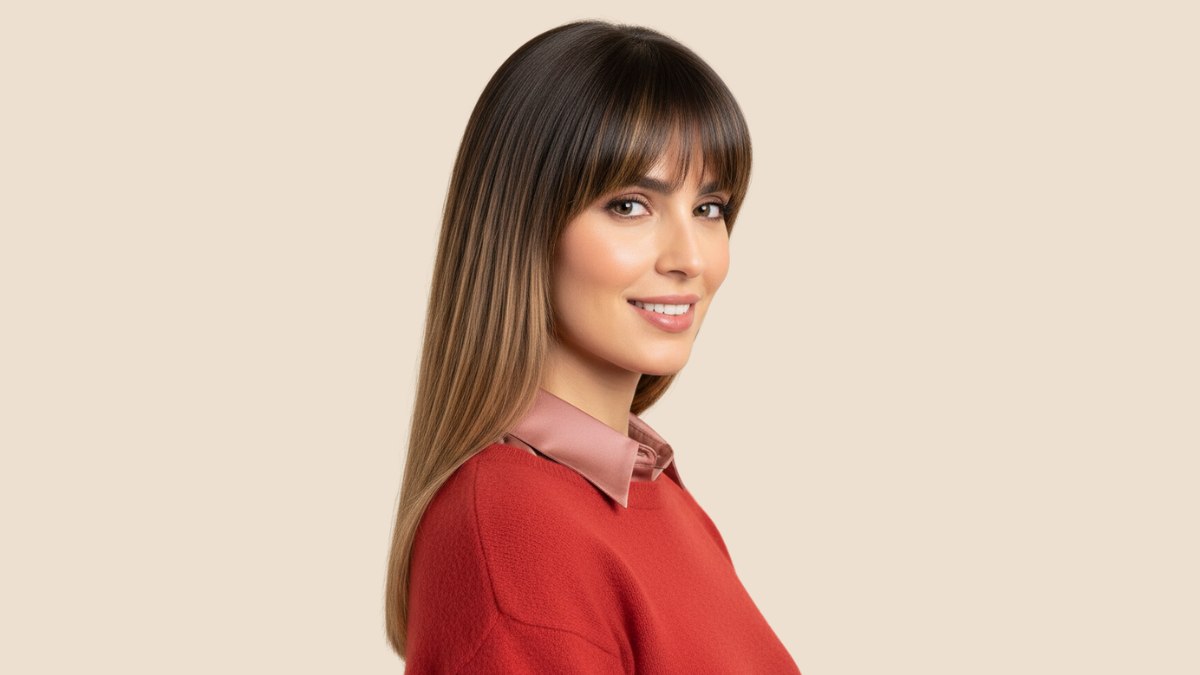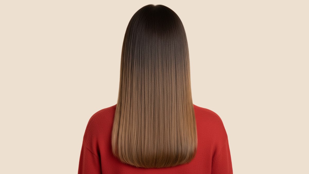 Le coiffage est lisse et parfaitement aligné, obtenu grâce à un brushing soigneux suivi d’un lissage, pour un fini brillant. Chaque mèche reflète la lumière de manière uniforme, mettant pleinement en valeur la dégradation de la couleur.