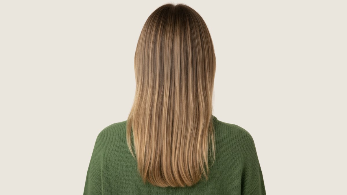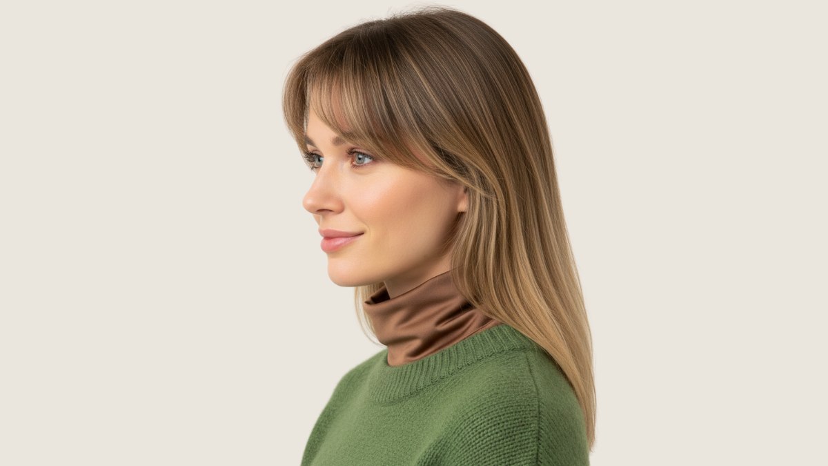 Le pull en maille vert olive s’accorde parfaitement avec cette coiffure. Sa teinte terreuse et feutrée complète les nuances blondes chaudes, créant une palette harmonieuse et naturelle. La maille texturée du pull ajoute un poids visuel au bas de la silhouette, équilibrant joliment la légèreté des cheveux au-dessus. Pendant ce temps, le col roulé en soie marron qui dépasse ajoute une touche luxueuse rappelant la richesse des racines plus sombres.