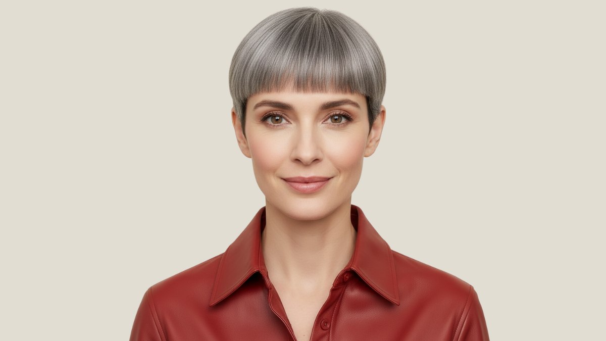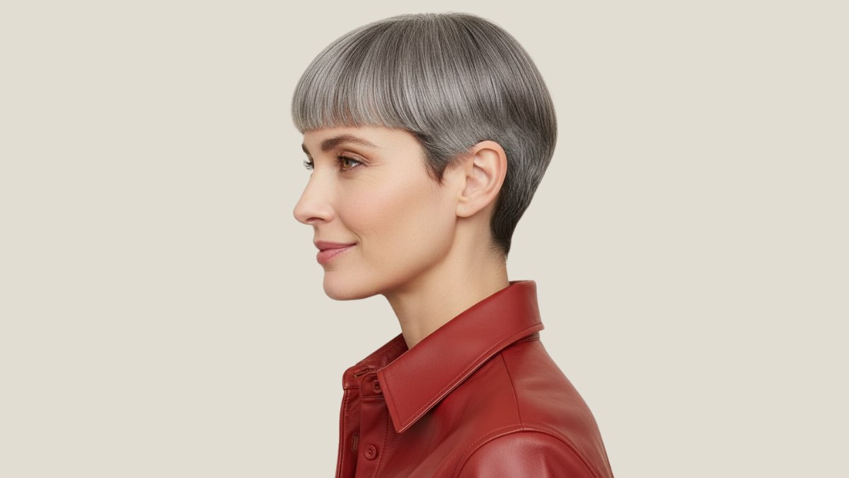 La chemise en cuir rouge foncé est un excellent choix avec cette coupe. Sa couleur crée un magnifique contraste avec le gris des cheveux, tandis que le cuir lisse rappelle la précision et l’audace de la coupe à la garçonne. Une association pour la femme qui assume pleinement son style et le porte avec assurance.