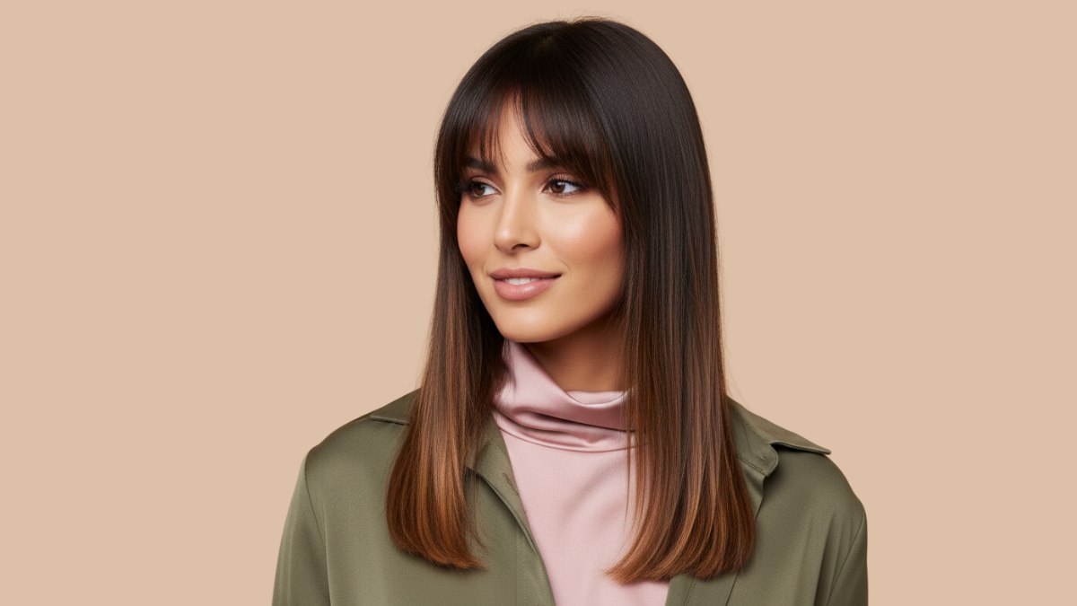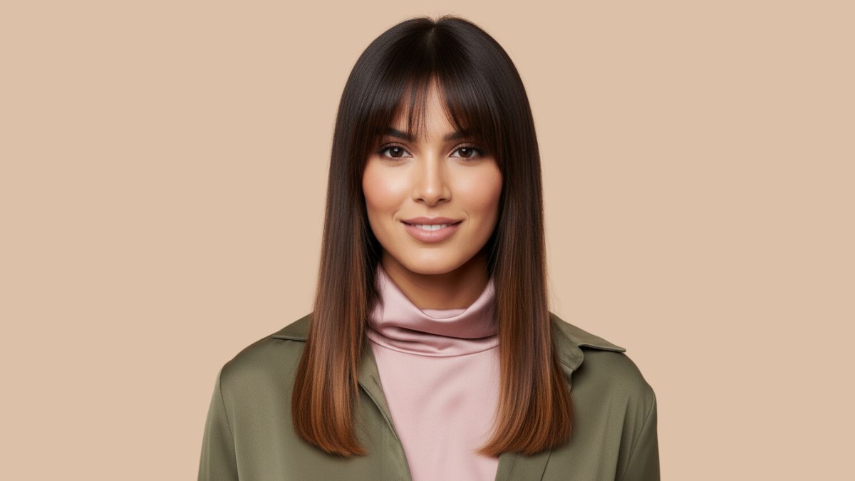 La chemise vert olive superposée à un col roulé rose soyeux met en valeur les nuances chaudes du balayage. Le vert olive souligne les reflets miel, tandis que le col roulé rose apporte une touche féminine qui équilibre la coiffure lisse. L’association permet à la tenue comme aux cheveux de rayonner sans rivaliser.