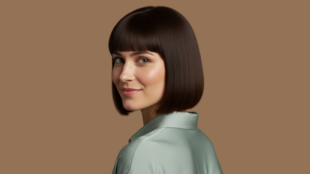 La couleur est un brun riche et brillant qui capte la lumière, créant de la dimension grâce à sa profondeur naturelle plutôt qu’à des contrastes marqués. Cette couleur en procédé unique possède un éclat presque miroir qui témoigne d’un coiffage expert. Une frange droite, coupée juste au-dessus des sourcils, ajoute une touche chic à l’ensemble.