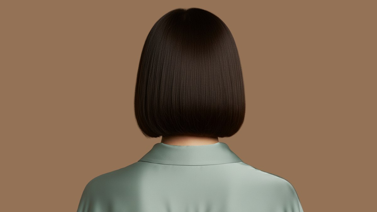 Le coiffage est lisse et soyeux, obtenu grâce à un brushing minutieux à la brosse plate, probablement finalisé au fer à lisser pour garantir la finition glossy. Aucun mouvement, aucune ondulation. Juste une perfection polie et épurée. Les cheveux retombent naturellement autour du visage, avec les pointes légèrement rentrées, créant la silhouette emblématique du carré.