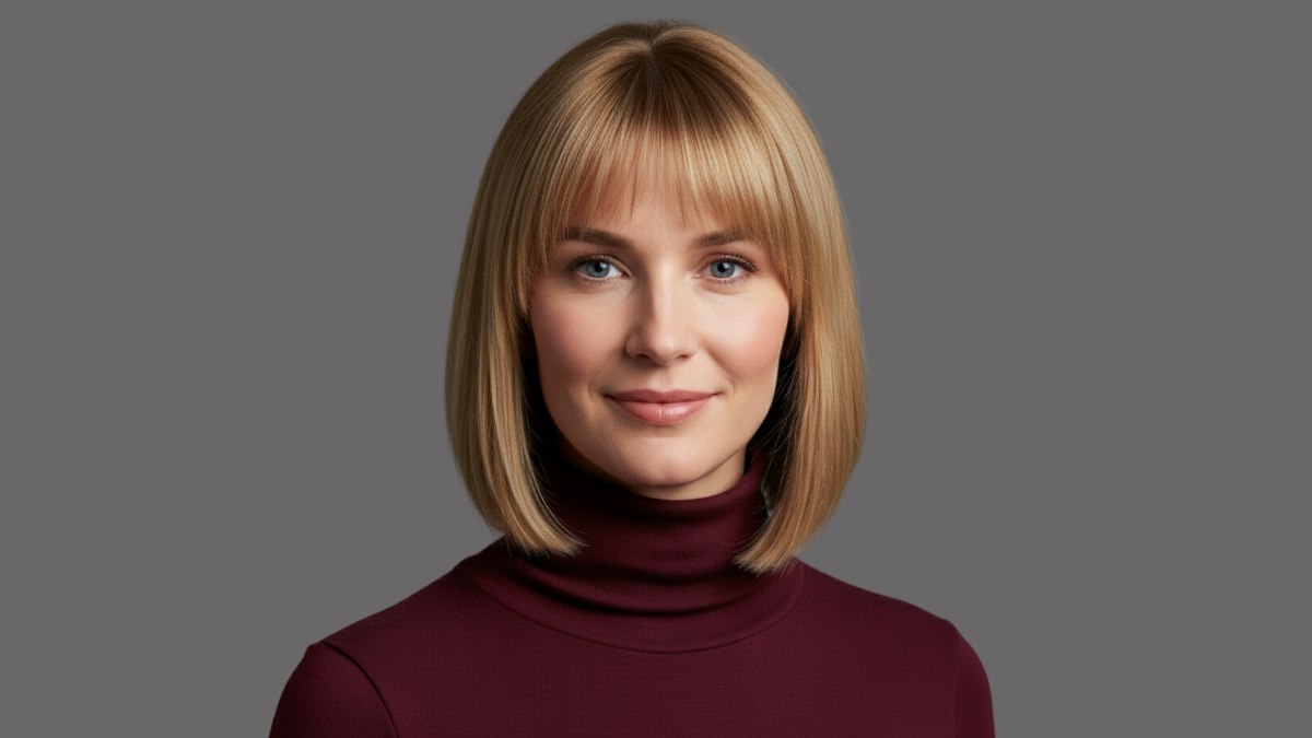 Voici l’essence même de l’élégance classique : un carré net à hauteur de nuque, exécuté avec une précision parfaite et associé à une frange droite et pleine. La coupe repose sur des lignes horizontales pures, créant une silhouette géométrique.