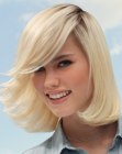 Des boucles grandes et blondes jouent le long des côtés de son visage et çà et là une mèche tombe sur les yeux. Du mouvement et du volume contrôlé donnent de l’énergie à la coiffure. Les cheveux au sommet de la tête sont lisses et les boucles commencent au niveau de sa bouche. De cette façon la coiffure reçoit une silhouette très flatteuse.