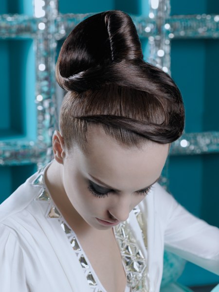 Une attache simple à partir d’une queue de cheval. La mèche est crêpée, lissée, laquée et positionnée à l’aide d’épingles puis glacée avec la laque Elnett de l’Oréal Professionnel.