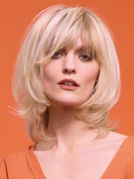 Tout en douceur, à l’image de son blond bébé, ce carré avec frange, légèrement dégradé, évite les contours trop nets et permet à la chevelure de conserver son volume.