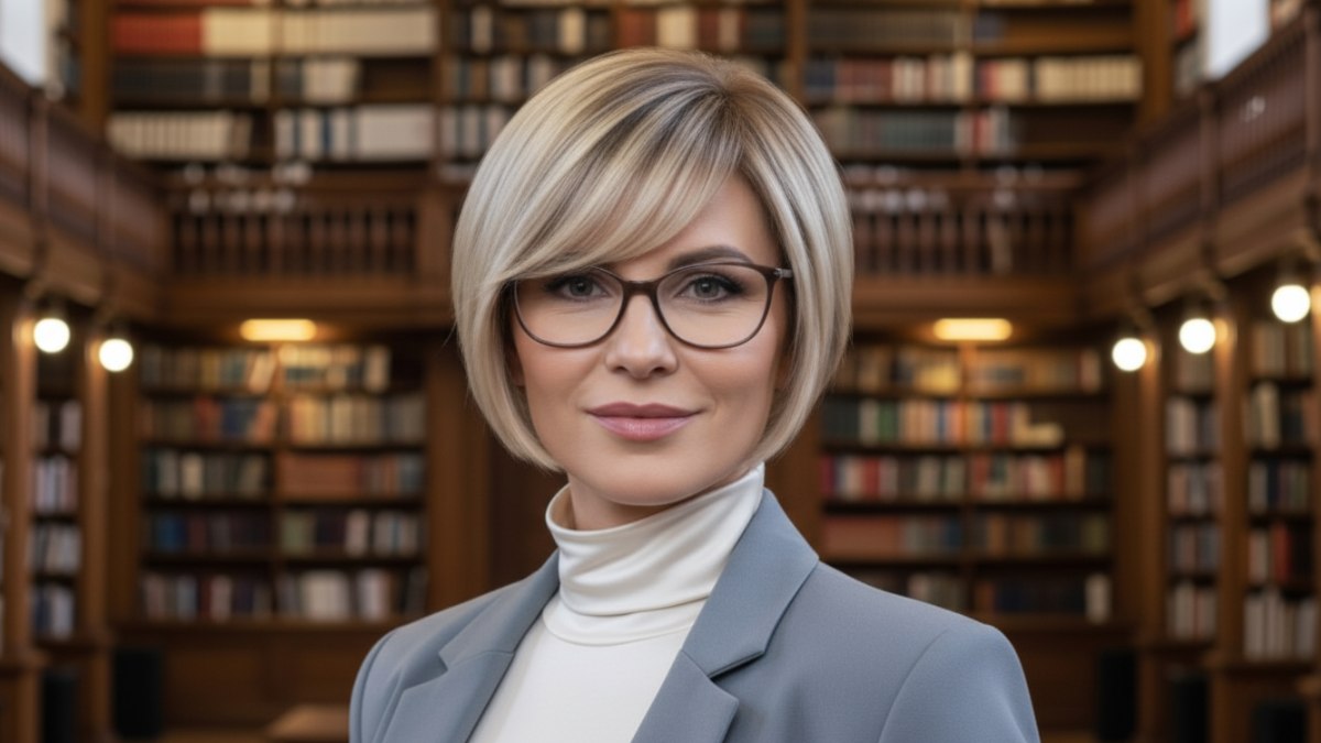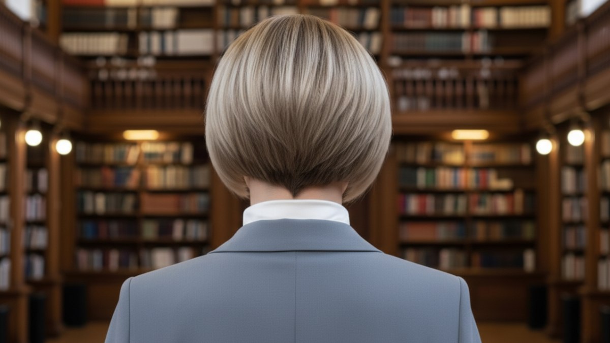 Le choix d’un col roulé blanc soyeux et d’un blazer complète idéalement la coiffure. Le col montant offre un fond net qui met les cheveux en valeur, tandis que la structure du blazer reflète la précision de la coupe. La teinte froide du blazer s’accorde harmonieusement au blond cendré, créant un ensemble monochrome très cohérent. Cette association montre que le carré anguleux fonctionne en toutes circonstances, avec une simplicité raffinée et un goût impeccable.