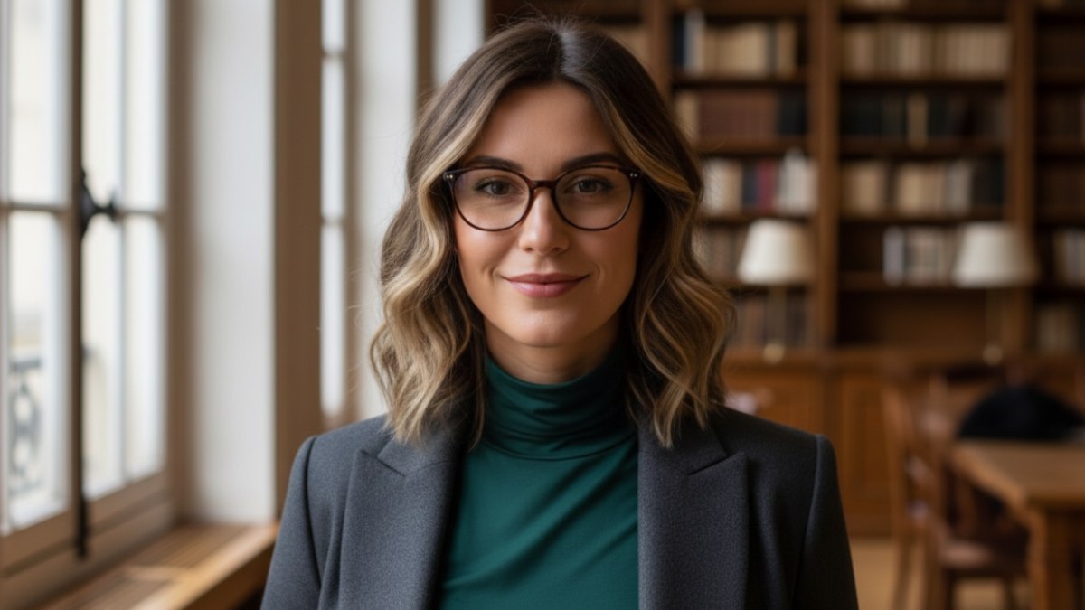 Associé à un col roulé soyeux bleu canard et un blazer anthracite, l’ensemble est d’une élégance remarquable. Le bleu canard contraste magnifiquement avec les tons caramel des cheveux, faisant ressortir chaque détail. Le col montant crée une toile de fond nette, tandis que le blazer apporte de la structure. Cette combinaison de cheveux ondulés et de vêtements ajustés est moderne, sophistiquée et idéale pour une vie aux multiples facettes.