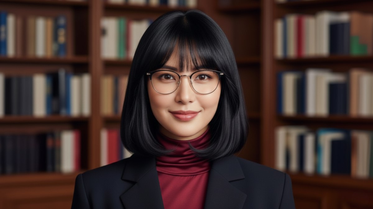 L’association avec le col roulé soyeux couleur bordeaux et le blazer noir est un choix remarquable. La teinte vin profonde apporte une chaleur subtile qui complète le noir froid des cheveux, tandis que la veste structurée fait écho à la précision géométrique de la coupe. Portée avec des lunettes, l’ensemble transmet sophistication, compétence et goût raffiné. Parfait pour faire forte impression !