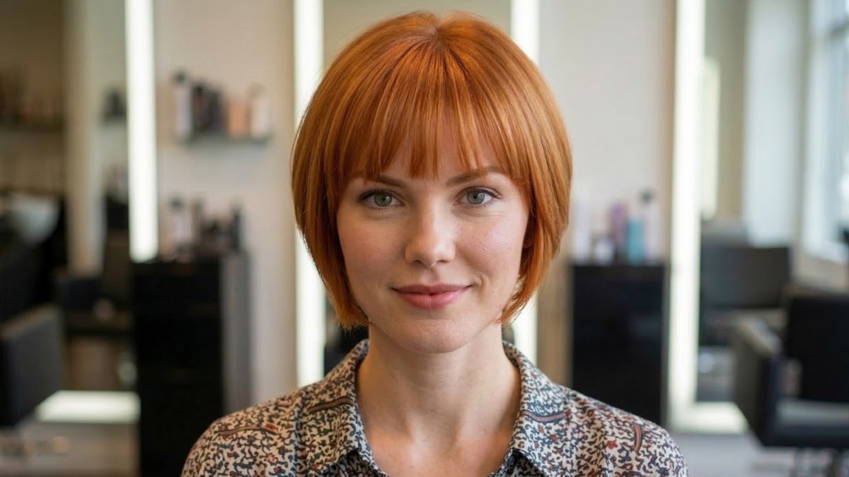 La coupe s’aligne sur la mâchoire, offrant un cadre harmonieux à la plupart des visages. La frange droite, coupée juste au-dessus des sourcils, confère au look une touche rétro chic et volontaire. Loin de figer le style, elle sert de contrepoint à la souplesse du carré, qui conserve assez de rebond pour paraître organique et naturel. La mise en forme est impeccable sans être rigide.
