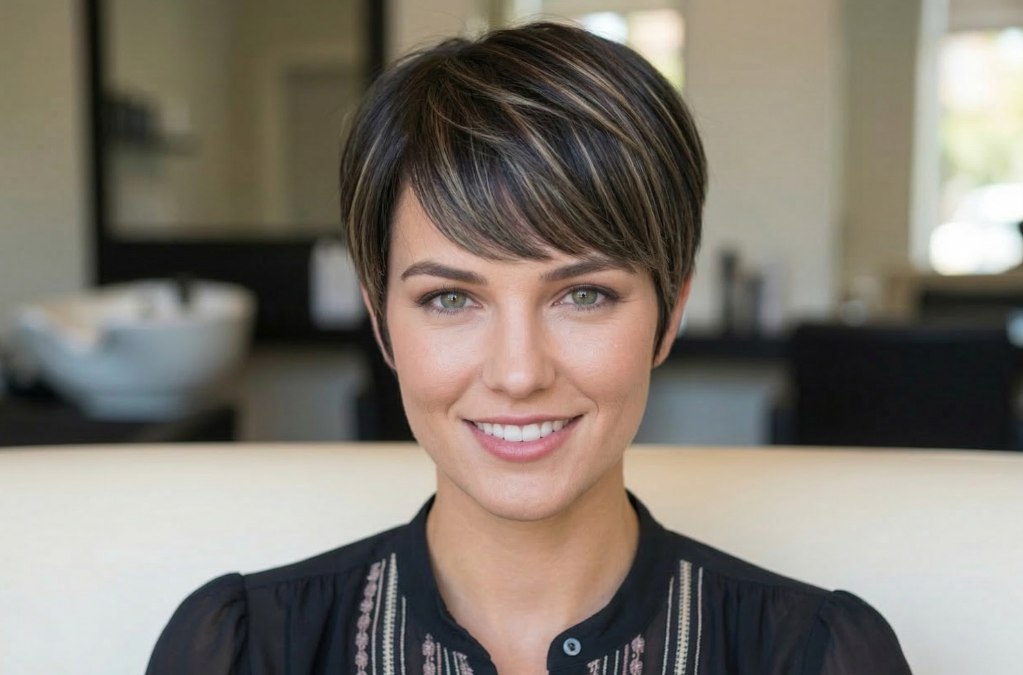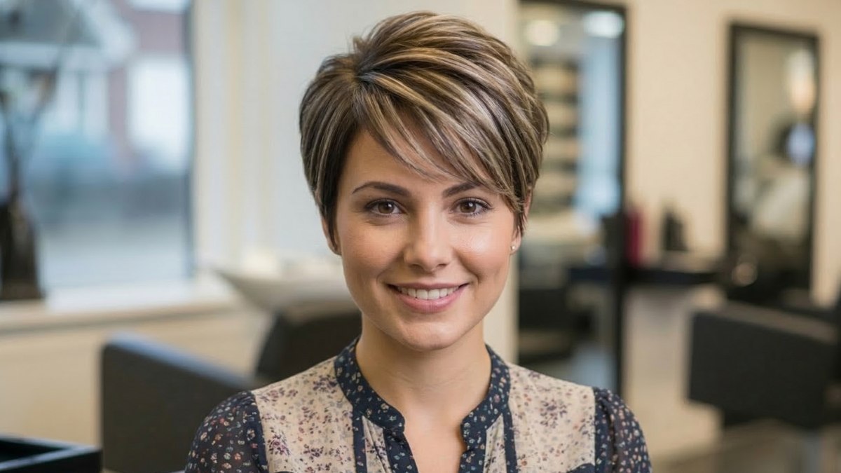 Cette variante du pixie joue avec brio sur les contrastes et la profondeur. Une base brun foncé sert d'écrin à des mèches blondes stratégiquement disposées pour accrocher la lumière, offrant ainsi à la chevelure une dimension presque tridimensionnelle. Plus qu'une simple coloration, c'est une véritable signature visuelle mêlant mouvement et personnalité.