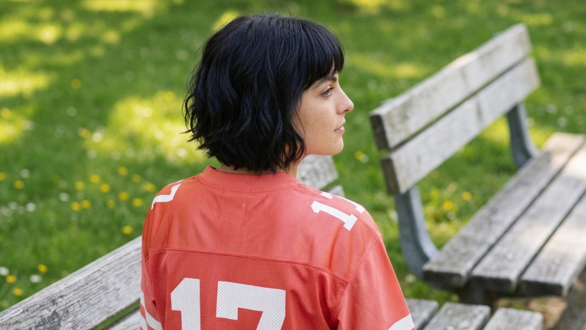 Les cheveux arrivent au niveau de la mâchoire en une seule ligne droite et franche, créant une silhouette si nette qu’elle semble avoir été tracée au rasoir et à la règle. Une frange épaisse et parfaitement droite repose sur le front, encadrant le visage comme un portrait et attirant immédiatement le regard vers les pommettes et les yeux.