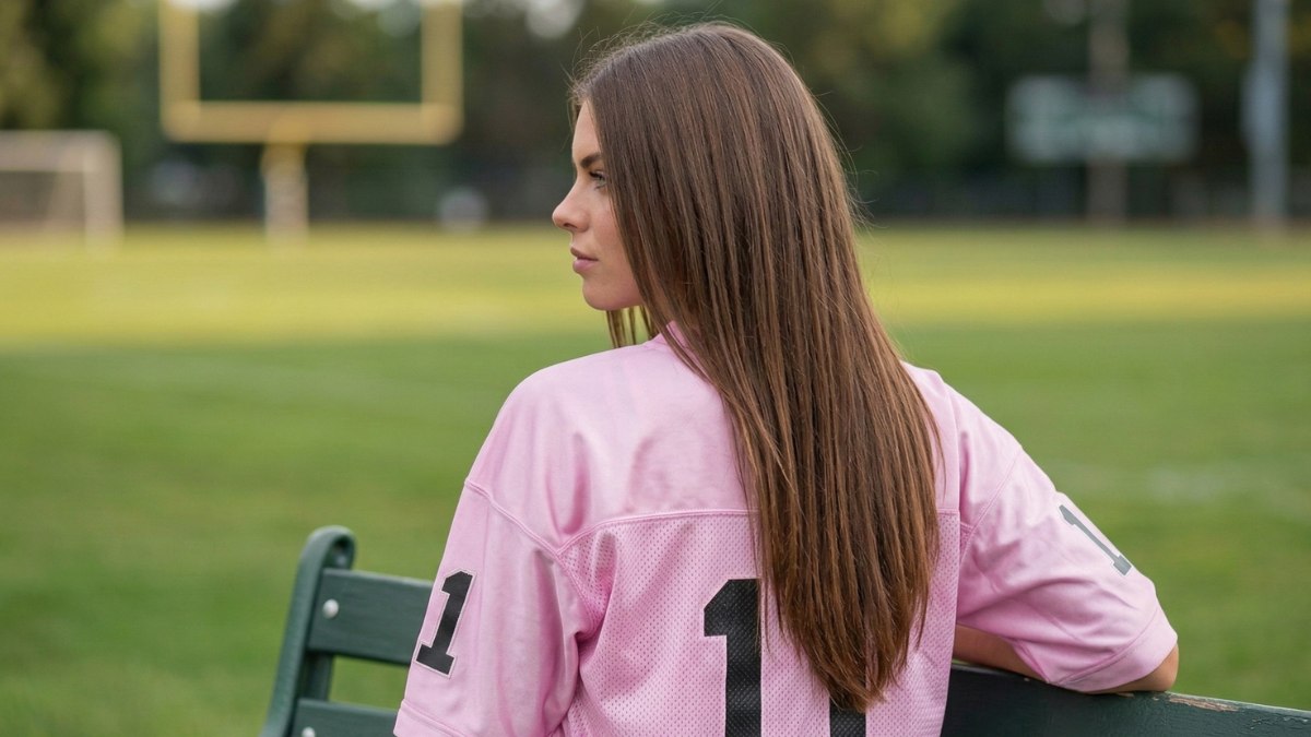 Le maillot de football couleur crème est le partenaire idéal pour ce look. Cette teinte classique reflète la confiance intemporelle du carré : discrète, structurée et totalement assurée. Le tissu lisse et brillant reprend la même qualité brillante que les cheveux, créant une continuité visuelle parfaite de la tête aux pieds.