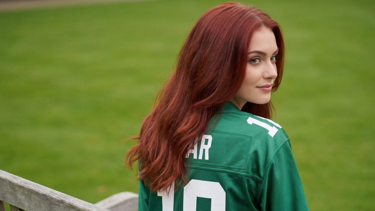 Le maillot vert forêt profond est absolument remarquable avec cette couleur. Le vert et l’auburn sont presque complémentaires sur la roue des couleurs, et ensemble ils créent une combinaison riche et contrastée qui paraît sophistiquée. Le tissu lisse et brillant du maillot amplifie encore la chaleur des cheveux.