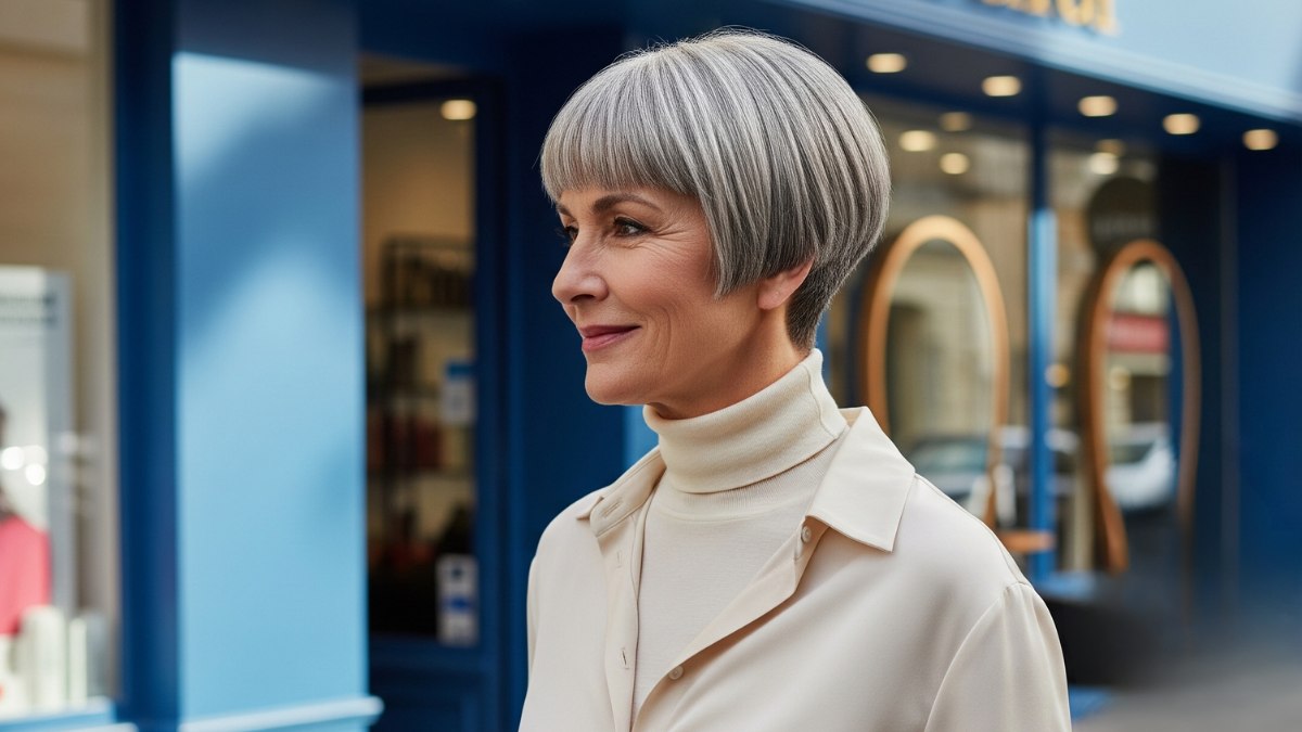 Cette coupe géométrique audacieuse prouve que les cheveux gris peuvent être splendides à toutes les longueurs. Avec ses lignes franches et sa frange coupée juste au-dessus des sourcils, elle affiche une allure résolument contemporaine. Les côtés effleurent les oreilles tandis que la nuque est dégagée, mêlant douceur féminine et style affirmé.