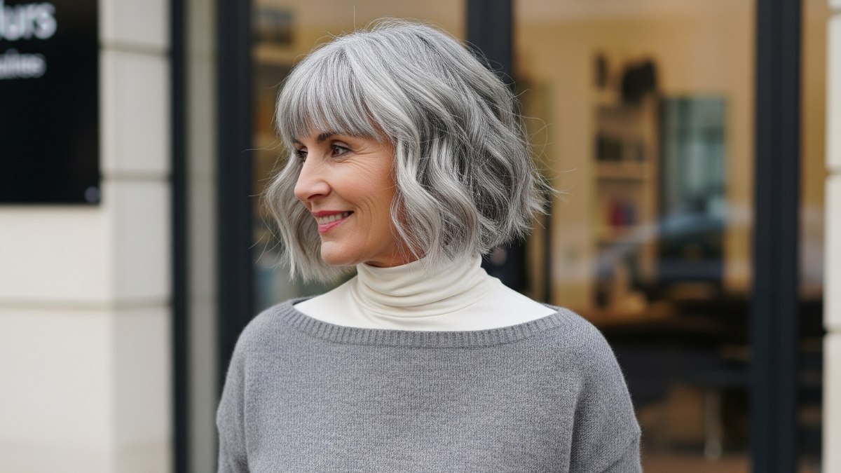 Ce carré met à l’honneur le mouvement naturel des cheveux gris, grâce à un dégradé bien pensé et une mise en forme délicate. Les dégradés douces ajoutent du rebond des racines jusqu’aux pointes, laissant s’exprimer toute la beauté de la texture ondulée. Une frange souple encadre joliment le visage, tandis que les reflets argentés apportent une profondeur captivante.