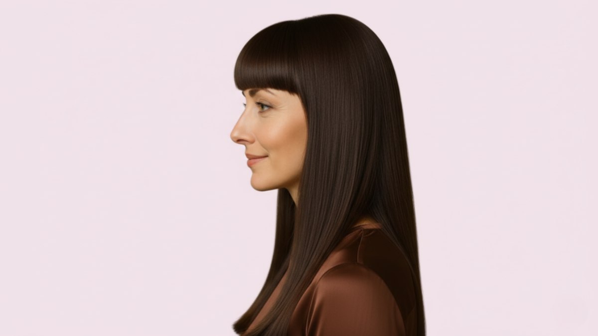 La couleur, un brun chocolat profond aux nuances subtiles, capte la lumière et offre une brillance irrésistible. Le coiffage mise sur la perfection : brushing à la brosse ronde puis passage du fer pour un fini miroir. Un entretien régulier des pointes et de la frange maintient ce style pourtant facile au quotidien.