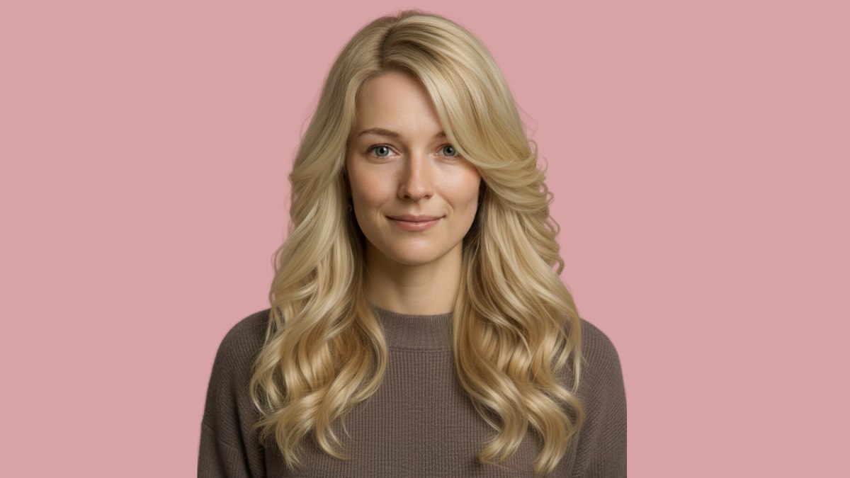 Les boucles commencent juste sous les oreilles, créant dimension et fluidité, tandis qu’une frange balayée sur le côté encadre délicatement le visage. Les mèches blondes se glissent dans chaque boucle comme des rubans de lumière, captant l’éclat du jour comme celui des bougies.