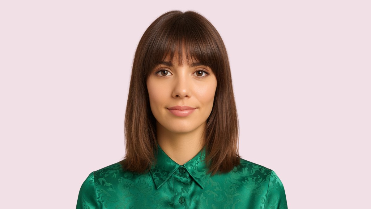 La frange a juste assez d’épaisseur pour tomber joliment sans alourdir. Parfaite pour dissimuler de petites imperfections du front et mettre en valeur le regard.