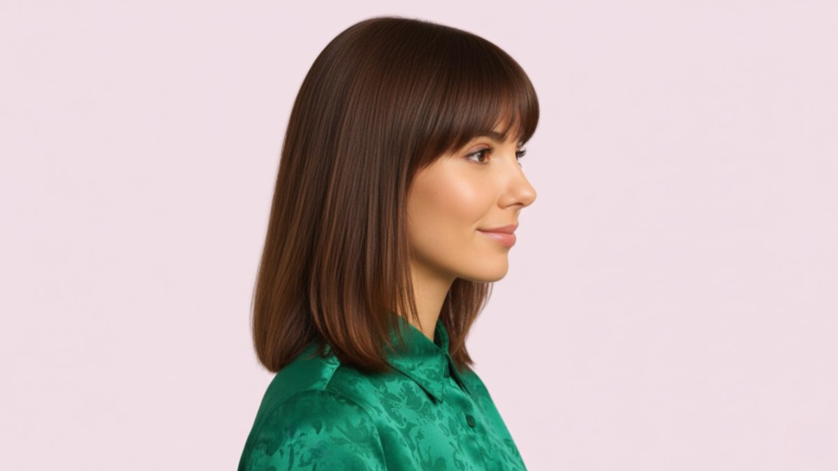 Cette coupe aux épaules est ce qu’on appelle un lob , ou long bob. Son charme réside dans la frange droite et douce qui encadre le visage comme un cadre parfait. Les cheveux tombent juste sous les épaules, avec un léger dégradé pour le mouvement, sans effet trop marqué.
