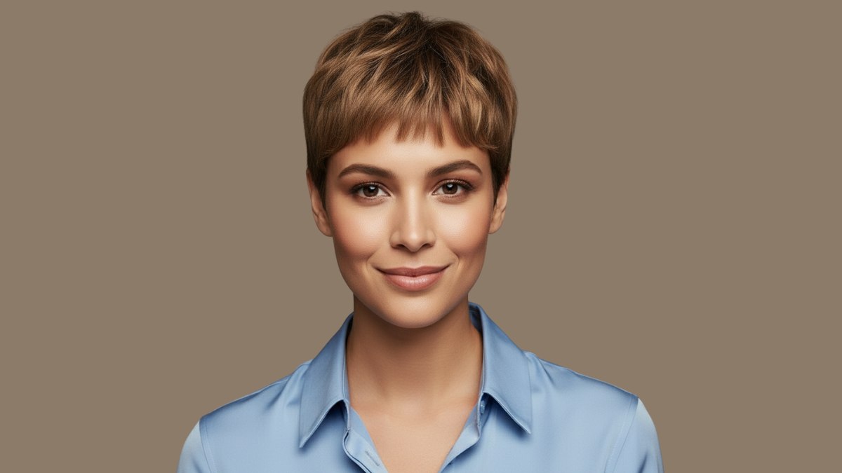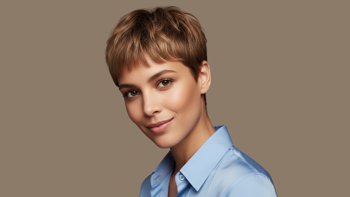 La couleur des cheveux est un blond sable agrémenté de subtils reflets caramel et de mèches plus foncées, brun clair. Cette approche multidimensionnelle donne de la profondeur et du relief à la chevelure, empêchant la coupe courte de paraître plate ou uniforme. Les mèches plus claires captent la lumière, surtout autour du visage, créant un effet naturellement ensoleillé qui met en valeur les traits de celle qui la porte.
