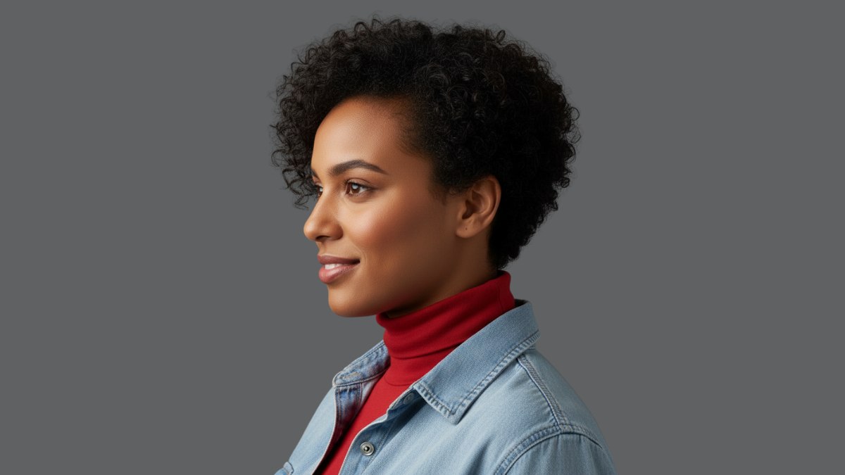 La tenue est choisie avec beaucoup de justesse pour accompagner cette coiffure. La chemise en denim clair offre une base décontractée, tandis que le col roulé rouge porté en dessous apporte chaleur et sophistication. Cette association de couleurs fonctionne à merveille avec les cheveux noirs naturels. Le rouge profond rappelle les sous-tons chauds de la chevelure, et le denim bleu froid apporte du contraste sans entrer en concurrence.
