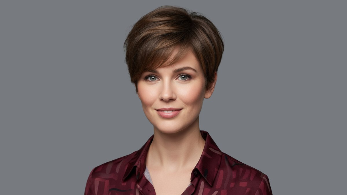 Le chemisier à motifs bordeaux, avec son design abstrait, constitue un excellent choix avec cette coiffure courte. La couleur souligne les nuances chaudes du brun, tandis que la coupe courte permet d’apprécier pleinement le motif détaillé et le col du chemisier sans rivaliser avec les cheveux. L’effet global est sophistiqué, artistique et résolument moderne.