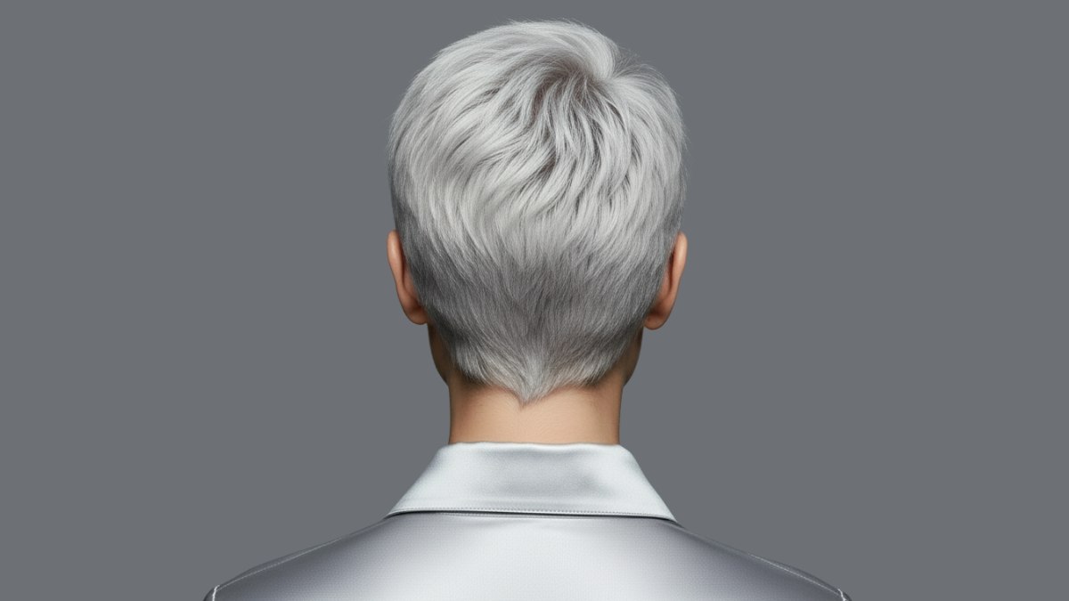 La couleur est l’élément qui transforme véritablement ce style court en quelque chose d’exceptionnel : un gris argent lumineux, à la fois sophistiqué et avant-gardiste. Il ne s’agit pas d’un gris classique, mais d’un choix volontaire, mode et affirmé, qui demande un réel savoir-faire pour être obtenu et entretenu. La couleur est appliquée de manière uniforme, avec un léger effet métallisé qui capte la lumière et confère à la chevelure une qualité presque éthérée.