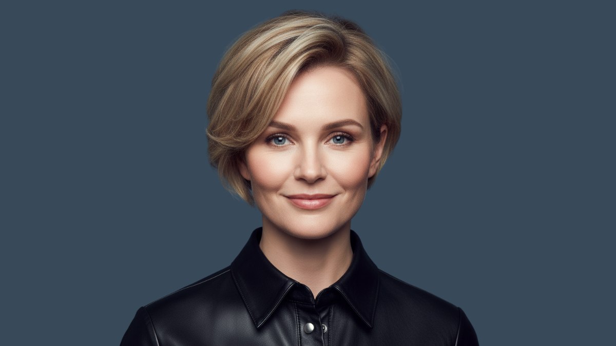 Le coiffage est lisse, avec les cheveux balayés vers l’arrière et sur le côté, formant une raie discrètement asymétrique. Une mèche frontale plus longue traverse le front et la tempe, adoucissant l’ensemble et créant un encadrement flatteur du visage.