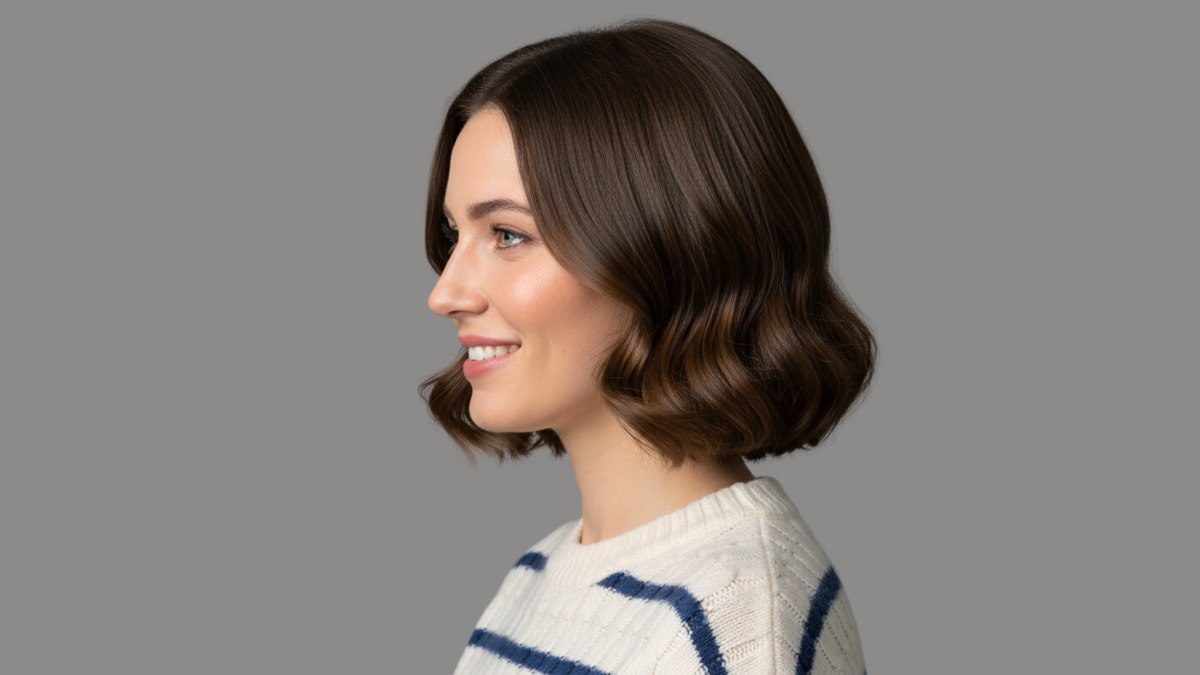 Cette coiffure met en valeur un carré ondulé qui arrive à mi-hauteur de la nuque, créant une silhouette parfaitement équilibrée qui flatte le visage sous tous les angles. La coupe présente des dégradés doux qui apportent du mouvement et permettent aux cheveux de former naturellement des ondulations en forme de S.
