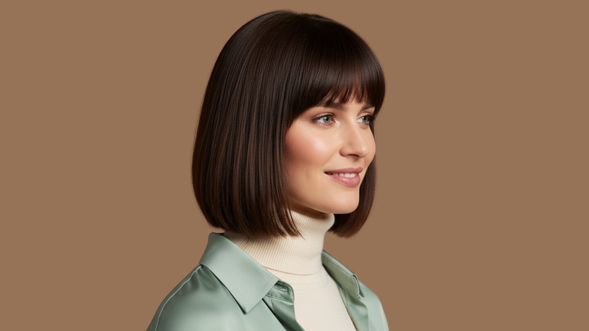 Voici une véritable leçon de coupe de précision : un carré droit parfaitement exécuté, dont la longueur se situe juste en dessous de la mâchoire. La ligne de coupe est impeccablement droite à l’arrière, créant une silhouette géométrique intemporelle. Ce qui distingue ce carré, c’est l’ajout d’une frange coupée nette qui arrive aux sourcils, encadrant le visage avec beaucoup de sophistication.