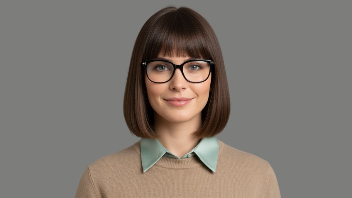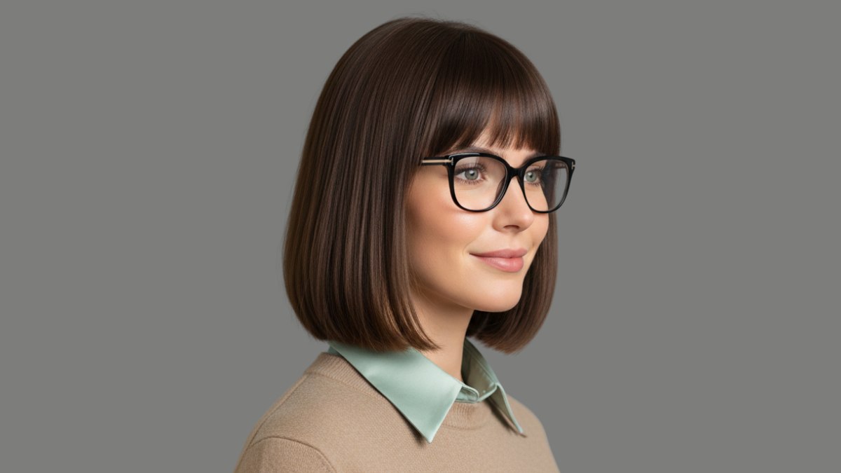 Cette coiffure est un carré intemporel, sublimé par l’ajout d’une frange affirmée qui attire immédiatement l’attention. La longueur arrive précisément au niveau du col, créant une ligne nette et structurée, ni trop courte ni trop longue.