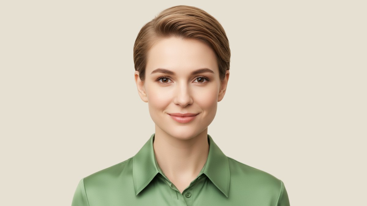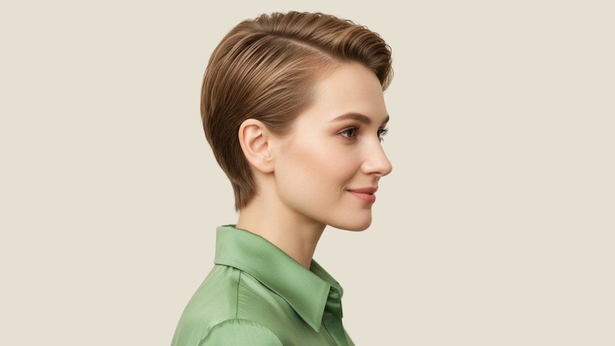 La chemise en soie verte à col classique est un excellent choix pour cette coupe à la garçonne. Les cheveux courts dégagent la nuque et les épaules, et le col structuré encadre joliment le visage sans rivaliser avec la coiffure. La douceur du tissu et ses lignes épurées reflètent le caractère raffiné de la coupe elle-même.