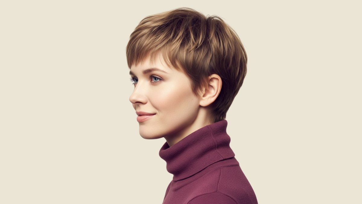 La couleur est un excellent exemple de la manière d’apporter de la dimension aux cheveux courts. La base est un brun moyen chaud, rehaussé de mèches caramel et miel, principalement concentrées sur le dessus et la frange, là où elles captent le mieux la lumière. Cette répartition des tons plus clairs accentue l’impression de texture et de mouvement, tandis que les sous-tons plus foncés sur les côtés et l’arrière apportent de la profondeur et évitent un effet plat.