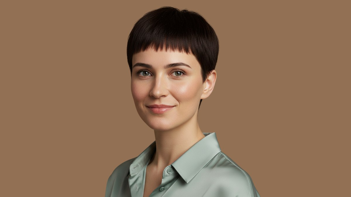 Cette coupe à la garçonne ultra-courte dégage une grande assurance et une modernité affirmée. Les côtés et l’arrière sont coupés très courts, créant une forme nette qui met en valeur la structure osseuse du visage et la ligne du cou.
