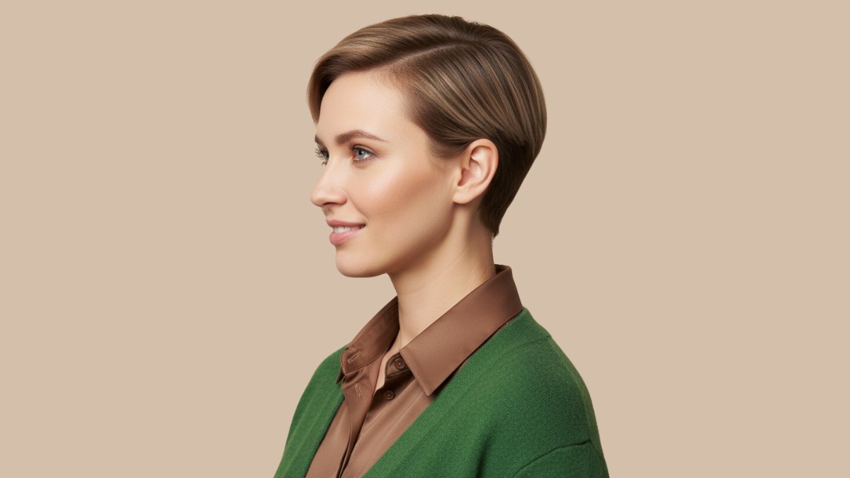 Le coiffage souligne l’élégante simplicité de la coupe, avec des cheveux lissés vers l’arrière et sur le côté de manière fluide, tout en conservant suffisamment de texture pour un rendu naturel et sans effort. De légères ondulations et courbes apportent douceur et féminité.