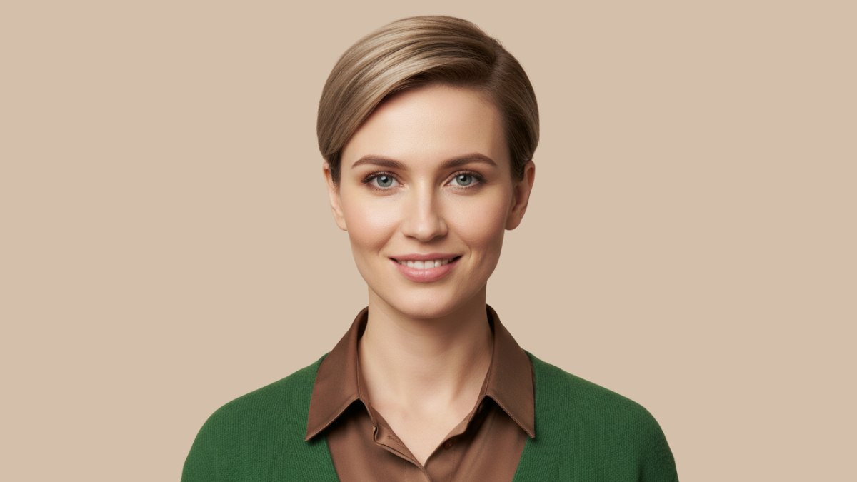 Le cardigan vert émeraude porté sur une chemise brune soyeuse crée une association de couleurs à la fois sophistiquée et inattendue. Le vert intense contraste superbement avec les mèches froides, tandis que la chemise rappelle la couleur de base, pour un ensemble parfaitement harmonieux.
